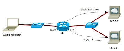 For simulation, we'll use a 10Mbps egress interface. Class one will be 1Mbps CIR/PIR, while class two will be 9Mbps/10Mbps CIR/PIR. See figure below for the setup used to simulate the solution.